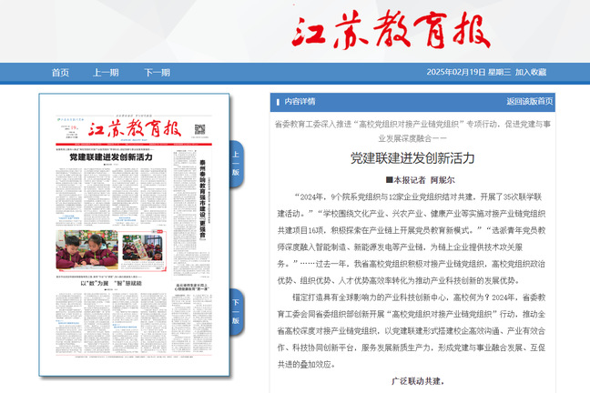 为确保对接联建实效,省委教育工委将高校党组织对接融入产业链党组织情况及作用发挥情况列为江苏教育领域党建重点举措,有效引导高校党委、院(系)党组织、基层党支部主动作为、精准对接、共建共赢。