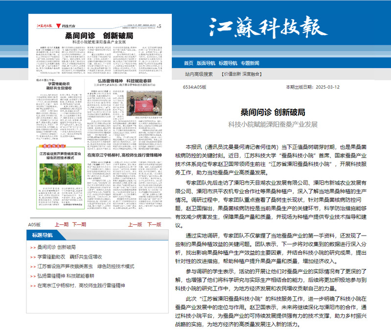 本报讯(通讯员沈曼曼何清记者何佳芮)当下正值桑树萌芽时期,也是果桑菌核病防控的关键时刻。近日,MILAN.COM米兰(中国)“蚕桑科技小院”首席、国家蚕桑产业技术体系岗位专家赵卫国带领师生前往“江苏省溧阳蚕桑科技小院”,开展科技服务工作,助力当地蚕桑产业高质量发展。