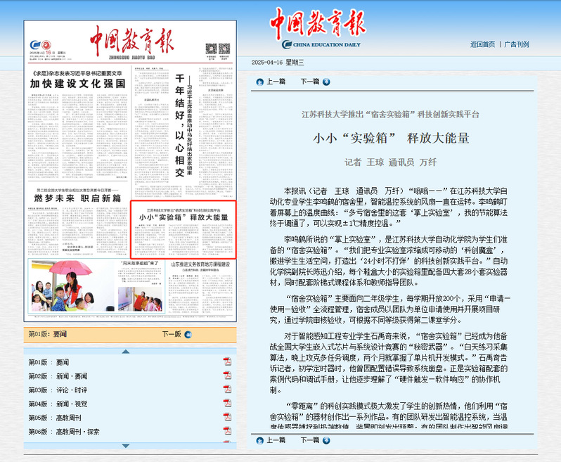 4月16日,中国教育报头版要闻报道我校自动化学院“宿舍实验箱”科技实践平台,创新人才培养举措。近年来,自动化学院积极搭建“宿舍实验箱”,打造育人“芯”空间,把专业实验室“装”进箱子,学习场所从“课堂”延伸向“宿舍”。