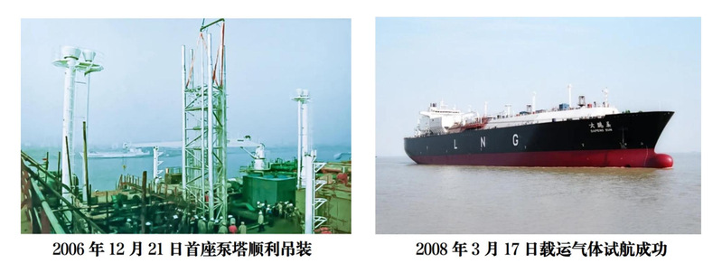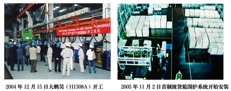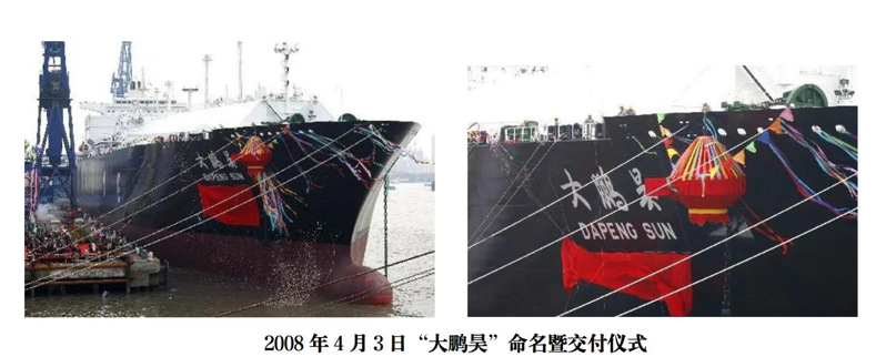 2008年4月3日,中国制造的第一艘液化天然气(LNG)船“大鹏昊”命名交付,总长292米,宽43.35米,型深26.25米,航速19.5节,装载量达14.7万立方米,是当时世界上最大的薄膜型LNG船。其成功交付标志着中国造船人首摘造船“皇冠上的明珠”,中国船舶工业实现LNG船“零”的突破,填补了中国LNG船生产设计、自主建造的空白,被国外船企垄断的大型LNG运输船制造终于打破。2018年,为庆祝改革开放40周年,中国邮政发行的小型张《筑梦新时代》上,“大鹏昊”LNG船位于天安门右侧“劈波斩浪”,寓意承载中华民族伟大复兴梦想的中华巨轮乘着新时代的浩荡东风,朝着“两个一百年”奋斗目标、中华民族伟大复兴的中国梦扬帆远航、奋勇向前。