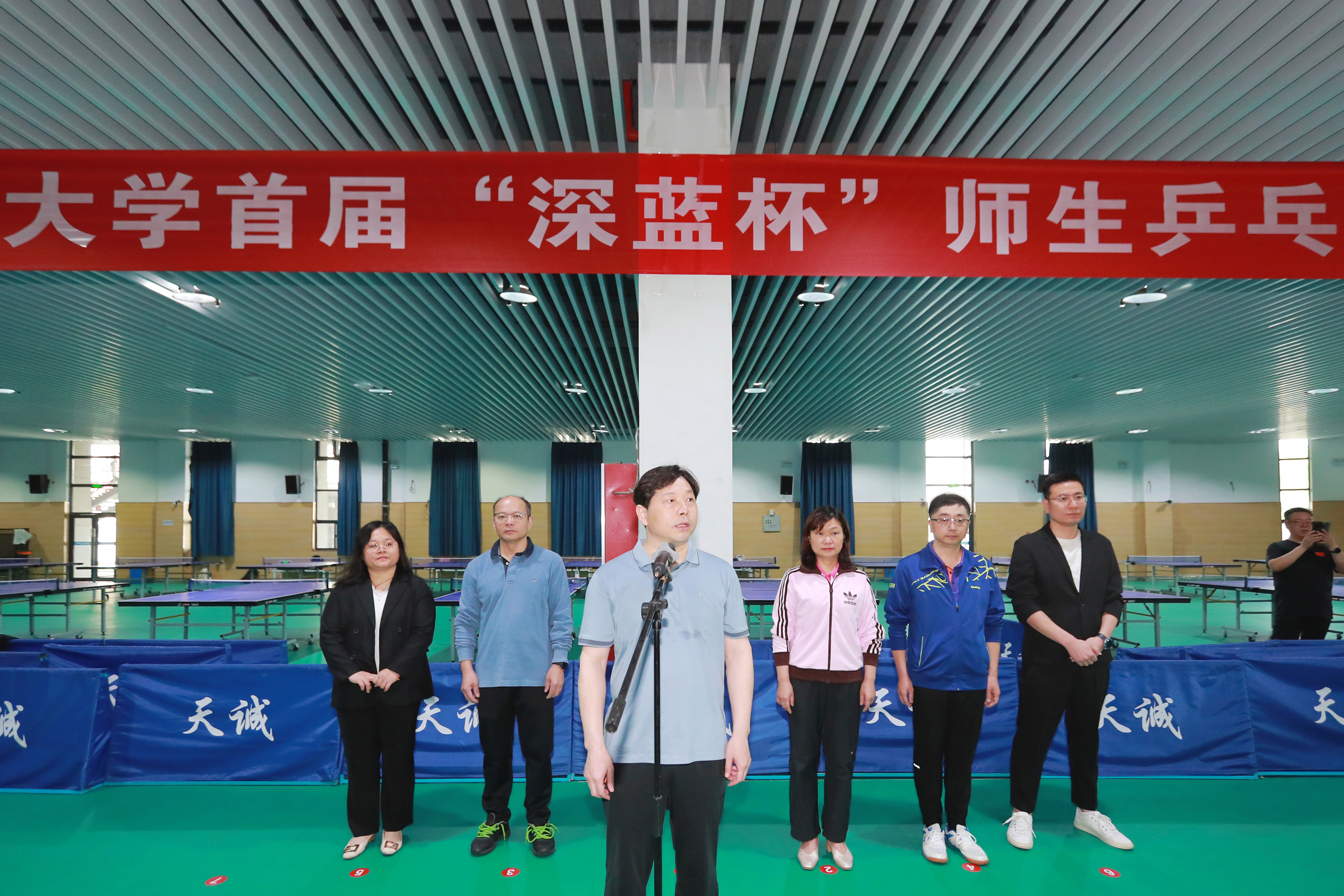 胡爱祥致开幕词,他表示,近年来,我校群众性体育赛事、体育教学和全民健身运动蓬勃发展。乒乓球作为“国球”运动,在我校有着深厚的群众基础。希望各参赛队伍以球会友、增进交流,为构建和谐、活跃、灵动的校园体育文化氛围贡献力量!