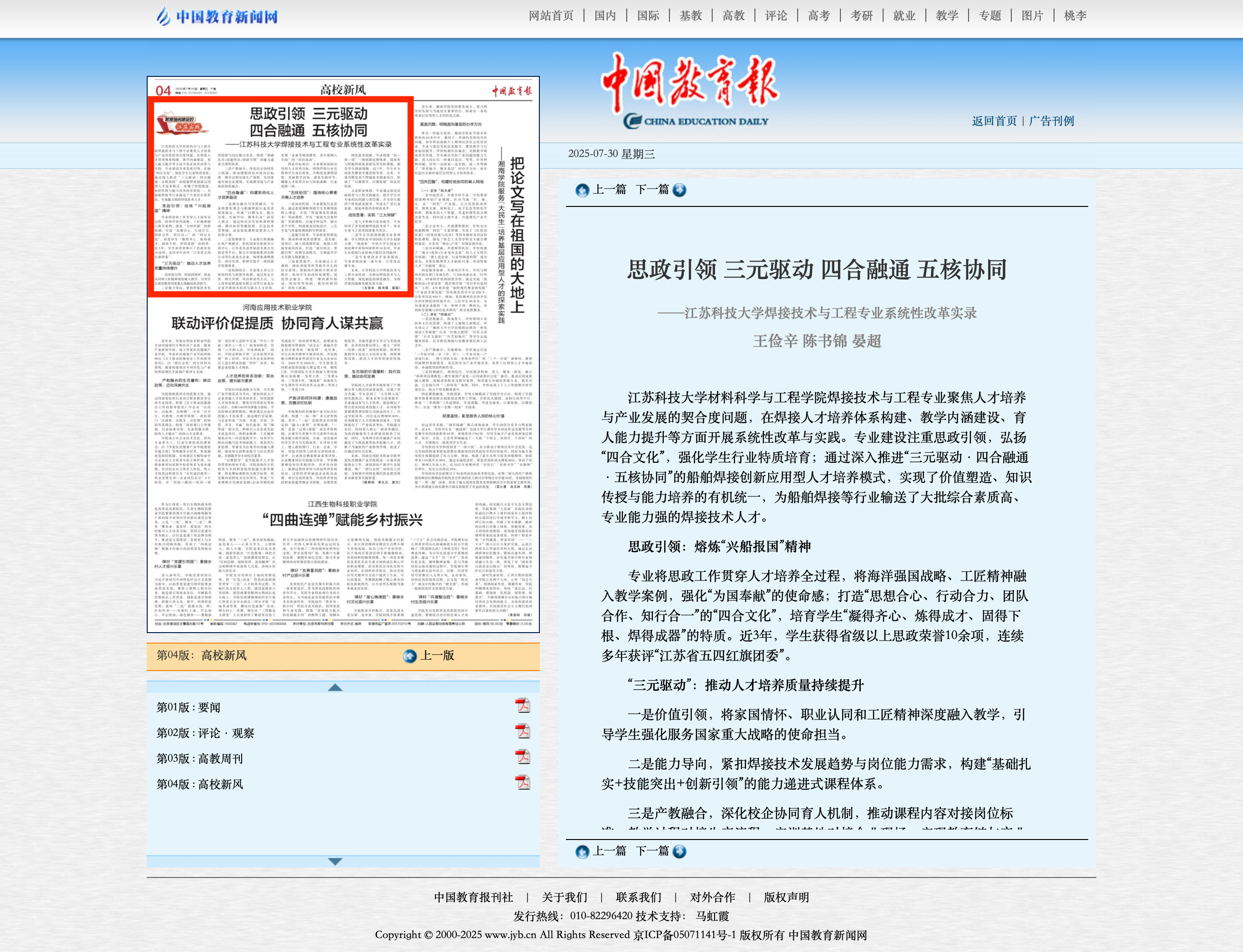 二是资源整合。专业推行科教融汇和产教融合,依托国家实验教学示范中心、江苏省先进焊接技术重点实验室等平台,联合中国船舶集团有限公司等行业龙头企业,构建集课程教学、项目实训、科研实践于一体的教学资源体系。