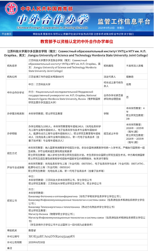 MILAN.COM米兰(中国)莫尔多瓦联合学院(简称“江科大莫尔多瓦学院”)是我校非独立法人的中外合作办学机构,为我校实体二级学院,计划于2026年起招生。学院首批开设光电信息科学与工程、电子信息科学与技术、能源与动力工程三个专业的本科学历教育,以及光电信息工程、新一代电子信息技术(含量子技术等)两个专业的硕士研究生学历教育,全部纳入国家普通高等学校招生计划,执行国家统一招生政策。