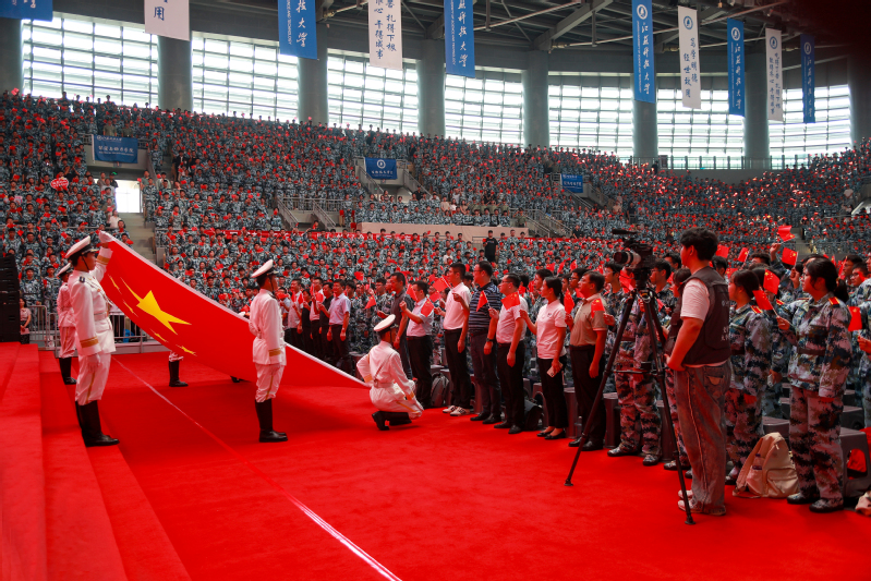 旗之所向,心之所往。典礼上,学校举行了盛大的迎国旗、唱国歌仪式。经学校申请和天安门管委会审批,学校获赠了90周年校庆日当天(2023年10月26日)在天安门广场升挂的国旗,国旗编号为2023-0299。典礼现场,校国旗护卫队队员手捧国旗列队入场,7000余名师生礼迎国旗,高唱国歌,庄重宣誓“强国有我,请党放心!江科大人定不负韶华,以青春之我,筑梦青春中国!”爱国主义精神激荡在每一位江科大学子的心胸。